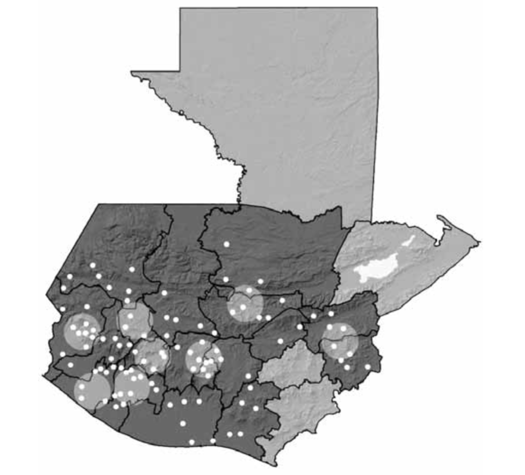Se presente a continuación el mapa de Guatemala, indicando por medio de puntos los lugares en que se ubican los 102 Grupos Gestores actuales. Así mismo, se indica por medio de ruedas más amplias la ubi­cación de los nodos, que son las oficinas de apoyo a los diversos Grupos Gestores que se encuentran en un territorio con lógicas económicas similares.